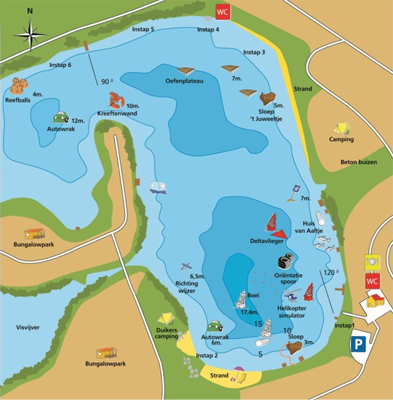 In de plas zijn diverse objecten geplaatst en het diepste punt is rond de 18 meter.